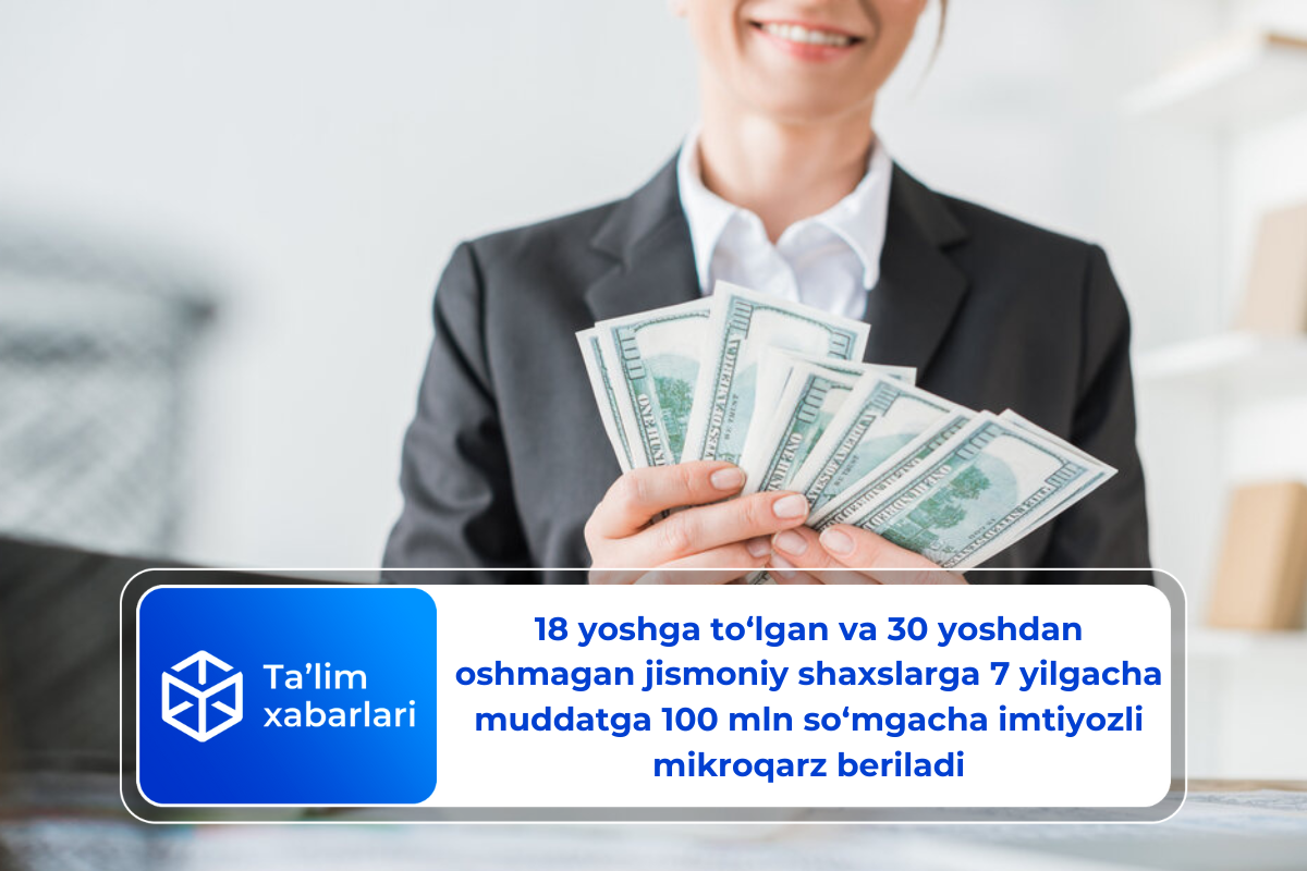 18 yoshga to‘lgan va 30 yoshdan oshmagan jismoniy shaxslarga 7 yilgacha muddatga 100 mln so‘mgacha imtiyozli mikroqarz beriladi