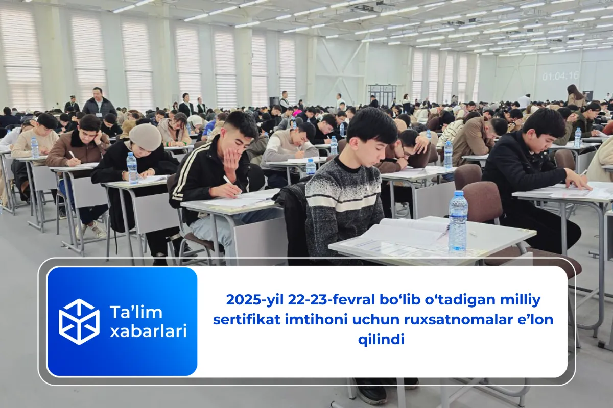 2025-yil 22–23-fevral (shanba-yakshanba) kunlari bo‘lib o‘tadigan matematika, fizika, tarix va geografiya fanlaridan milliy sertifikat imtihoni uchun ruxsatnomalar e’lon qilindi.