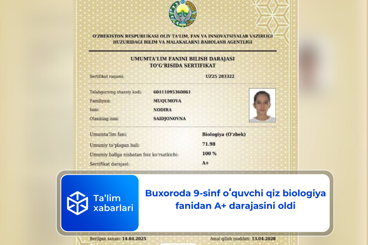 Buxoro viloyati Buxoro shahridagi umumiy o’rta ta’lim maktabning 9-sinf oʻquvchisi Muqumova Nodira biologiya fanidan A+ darajasini olgan. Ushbu natija kirish imtihonlaridan biologiya fanidan eng maksimal ballga erishish imkoniyatini beradi.