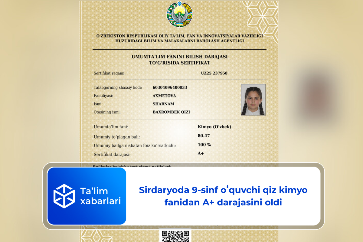 Sirdaryo viloyati Sayxunobod tuman ixtisoslashtirilgan maktabning 9-sinf o’quvchisi Axmetova Shabnam milliy sertifikat imtihonida kimyo fanidan A+ darajani qo’lga kiritdi.