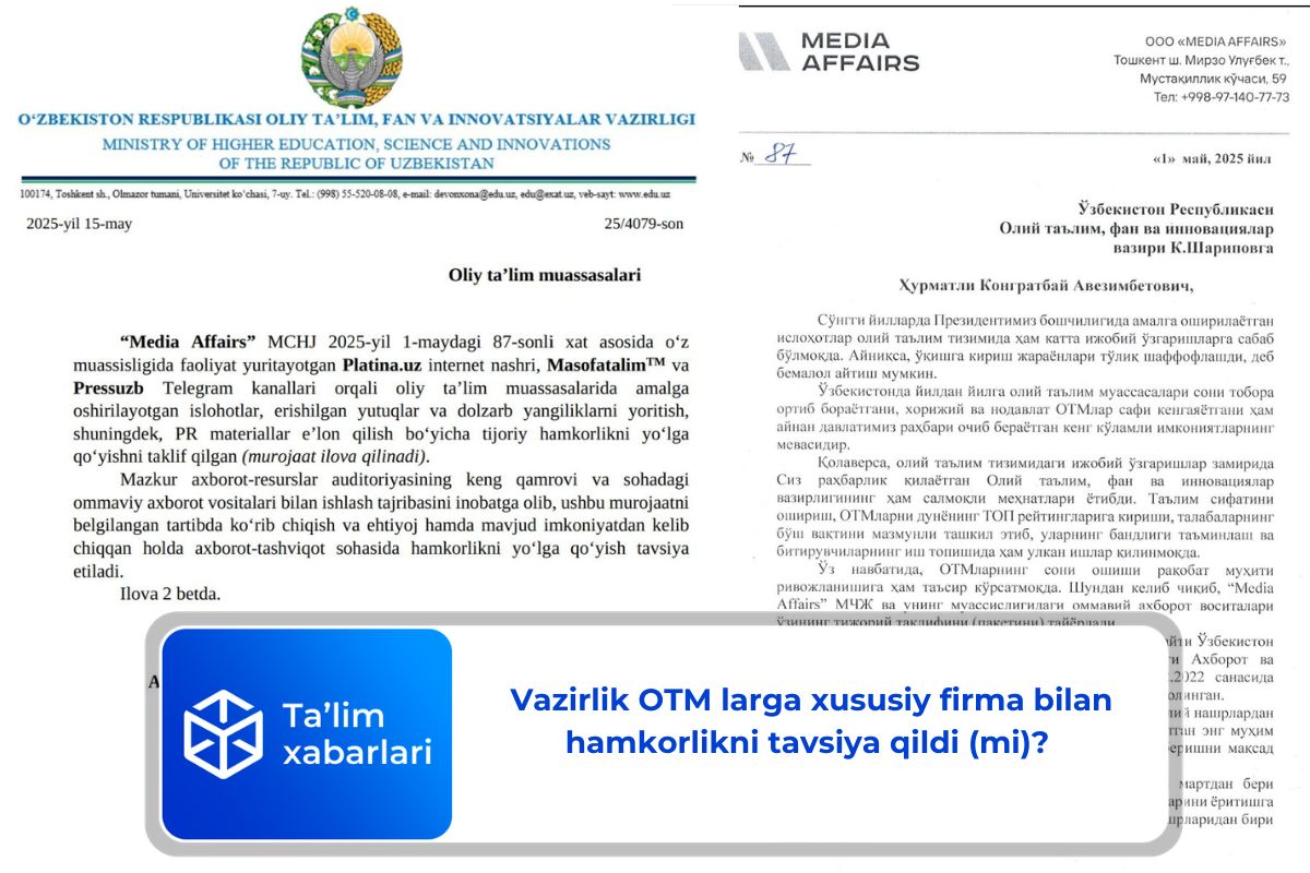 “Media Affairs” MCHJ tomonidan vazirlikka oliy ta’limdagi islohotlarni yoritish, piar materiallar chop etish va axborot-tahliliy hamkorlik bo‘yicha taklif kelib tushgan. Bu taklifga javoban, vazirlik tomonidan oliy ta’lim muassasalariga tavsiyaviy mazmundagi xat yuborilgan. Unda tijoriy shartnoma tuzish bo‘yicha hech qanday buyruq yoki majburiyat belgilanmagan, — dedi Abduqunduzova.