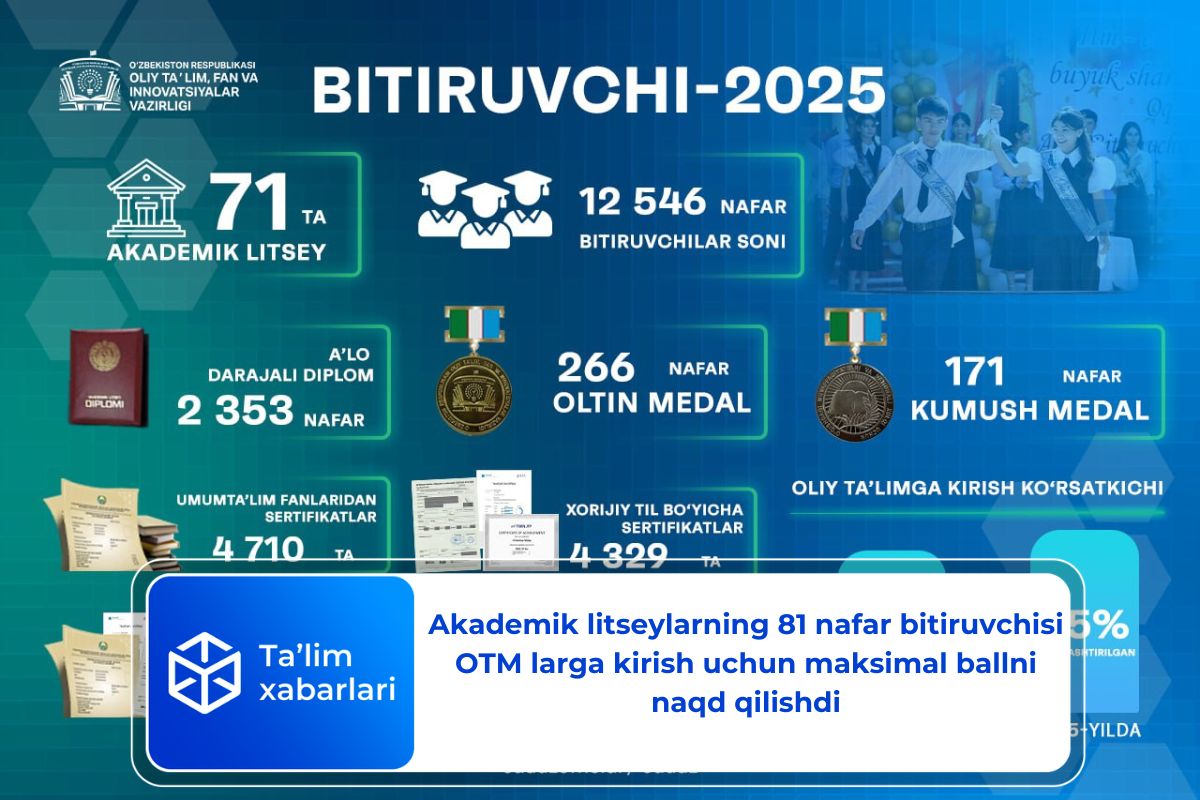 2024/2025-o‘quv yilida O‘zbekiston bo‘ylab 71 ta akademik litseyni 12,5 ming nafardan ortiq o‘quvchi bitirib, ular orasida 2,3 ming nafardan ziyodi a’lo darajadagi diplomga ega bo‘ldi.