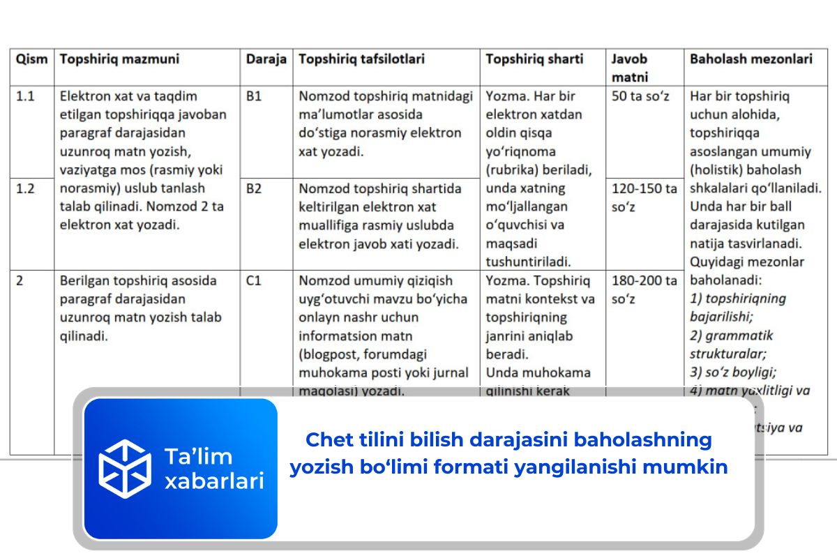 2025-yil oktyabr oyidan boshlab chet tilini bilish darajasini baholash bo‘yicha ko‘p darajali (multilevel) tizimning yozish bo‘limi formati va baholash mezonlarini yangilash rejalashtirilmoqda. Bu haqda Chet tillarni bilish va egallash darajasini baholash boshqarmasi (NSFLA) xabar berdi.