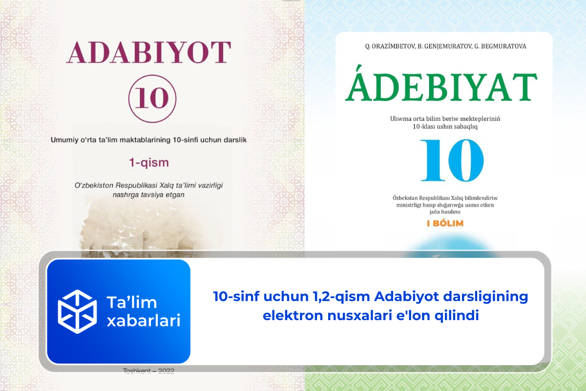 Respublika ta’lim markazi 10-sinf 1,2-qism Adabiyot darsligining elektron nusxalarini e’lon qildi.