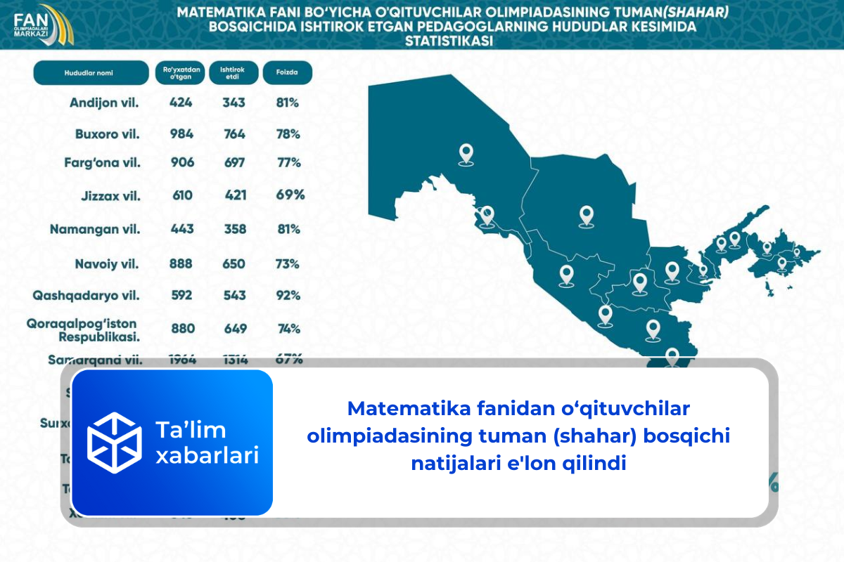 Olimpiadaning matematika fani bo’yicha natijalarini hududlar kesimida tanishishingiz mumkin: