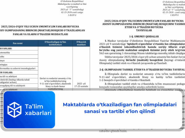 Maktabgacha va maktab ta’limi vazirligining 2025-yil 5-sentyabrdagi 02-35-2939-sonli xati va ilovasi e’lon qilindi.