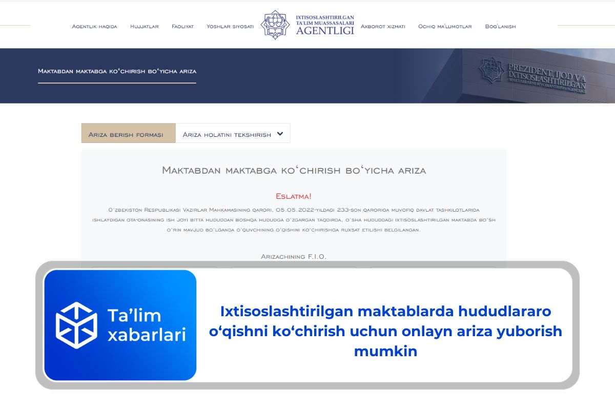 Ixtisoslashtirilgan maktablarda 2025/2026-o‘quv yili oldidan oʻquvchilarning oʻqishini bir hududdan boshqa hududga ko‘chirishga zarurat tug‘ilayotgan bo‘lsa, arizalarni joriy yilning 3-8-noyabr kunlari Respublikamizning barcha hududlaridan turib, transfer.piima.uz platforma orqali Agentlikka tez va oson yuborish mumkin.