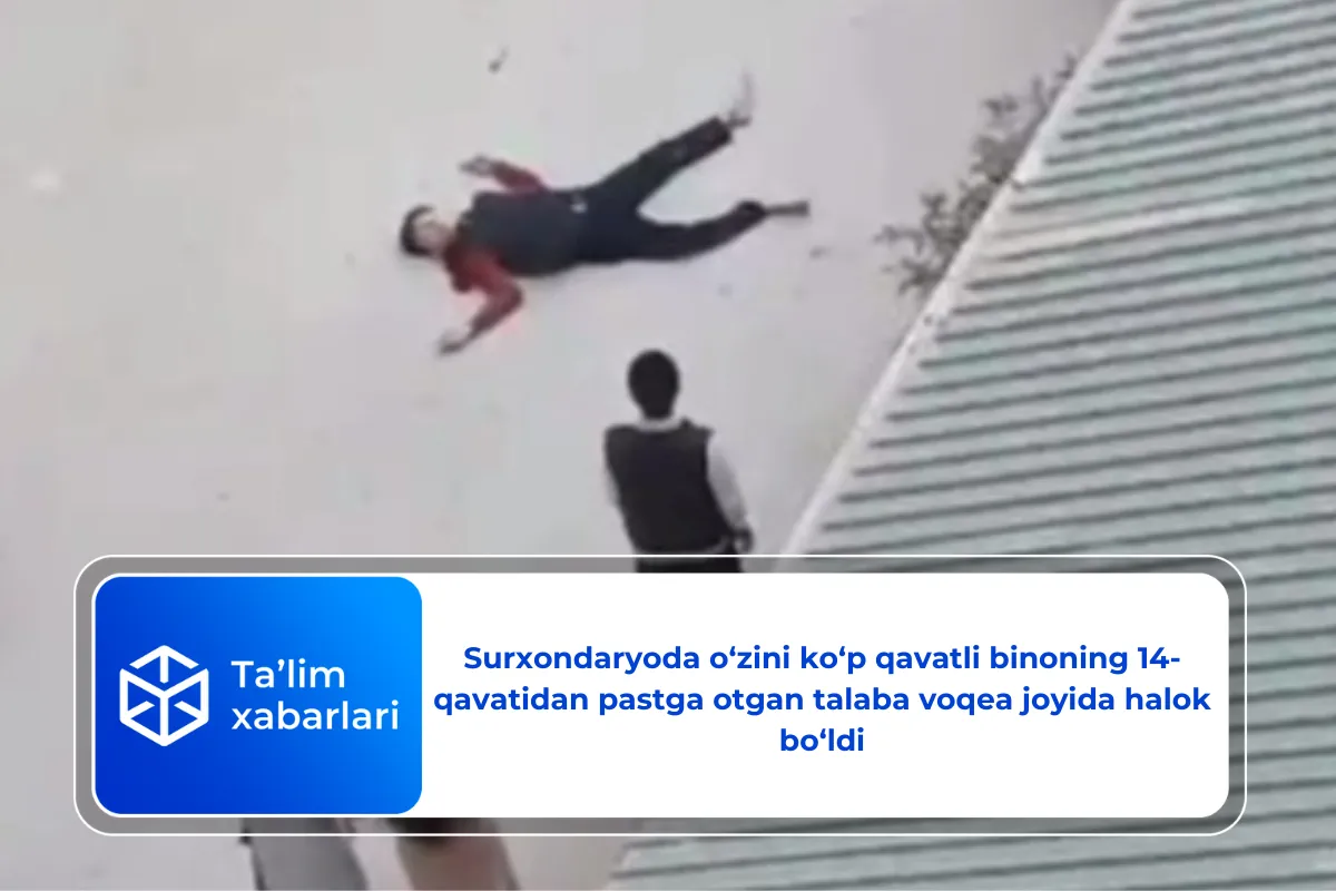 Joriy yilning 19-noyabr kuni Surxondaryo viloyatida 18 yoshli talaba o‘zini ko‘p qavatli binoning 14-qavatidan pastga otgan.