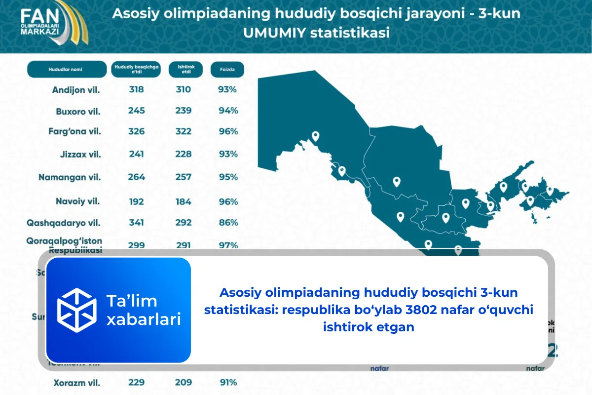 Fan olimpiadalari markazi tomonidan kecha bo‘lib o‘tgan olimpiadada qatnashgan o‘quvchilarning hududlar kesimidagi 3-kundagi statistikasi e’lon qilindi.
