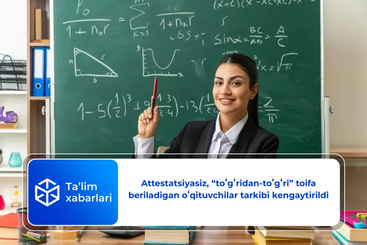 Attestatsiyasiz, “toʻgʻridan-toʻgʻri” toifa beriladigan oʻqituvchilar tarkibi kengaytirildi