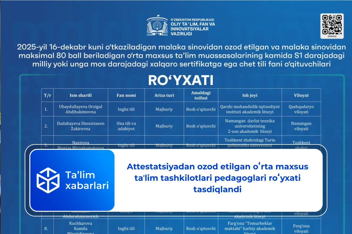 Shunga ko‘ra, Oliy taʼlim, fan va innovatsiyalar vazirligi tomonidan imtiyoz qoʻllaniladigan sertifikatga ega 35 nafar oʻqituvchilar roʻyxati eʼlon qilinmoqda.