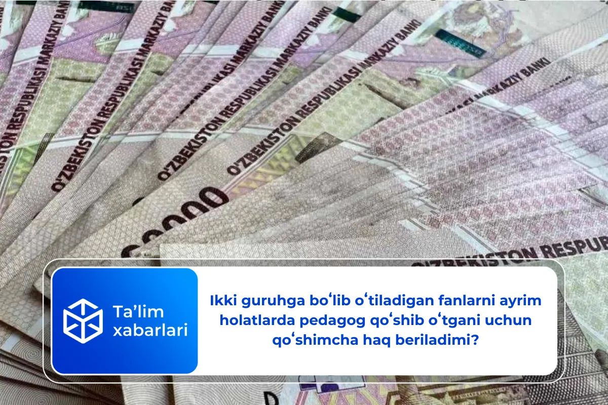 Shuningdek, Vazirlar Mahkamasining 2005-yil 21-dekabrdagi 275-son qarori bilan tasdiqlangan “Xalq taʼlimi xodimlari mehnatiga haq toʻlash toʻgʻrisida nizom”ning 22-bandiga koʻra, boʻlib oʻqitiladigan fanlar boʻyicha guruhlardan birining oʻqituvchisi turli sabablarga koʻra darsda boʻlmagan holatlarda guruhlar qoʻshib oʻqitiladi hamda qoʻshib oʻqitganligi uchun qoʻshimcha haq toʻlovlarini amalga oshirish nazarda tutilmagan.
