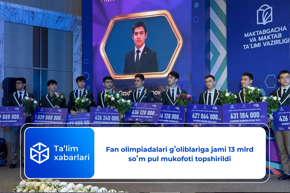 Eng muhimi, oriy yilda ilk marta nufuzli xalqaro fan olimpiadasida oltin medal olgan oʻquvchiga 1 mlrd soʻmdan koʻproq pul mukofoti berilmoqda.