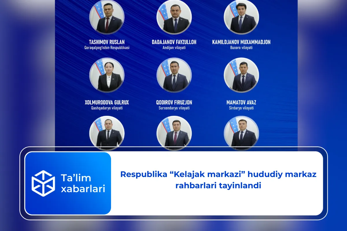 Maktabgacha va maktab taʼlimi vazirligi huzuridagi Respublika “Kelajak markazi” hududiy markaz rahbarlari tayinlandi. Xususan: