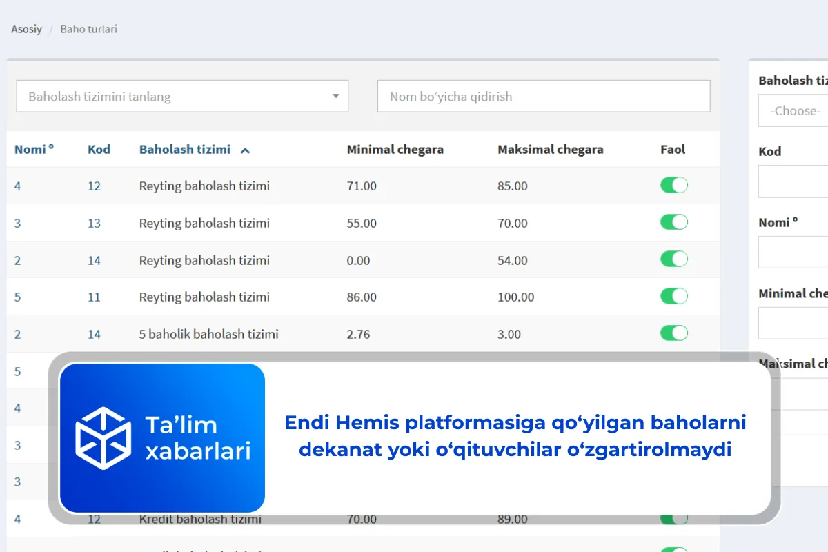 Avvalgi tartibga ko‘ra, fan o‘qituvchisi yoki dekanat xodimlari tizimga kiritilgan baholarni mustaqil ravishda o‘zgartirish imkoniyatiga ega edi. Endi Hemis platformasiga qo‘yilgan baholarni dekanat yoki o‘qituvchilar o‘zgartirolmaydi. Platformaga qo‘yilgan bahoni o‘zgartirish vakolat faqat o‘quv ishlari bo‘yicha prorektorda bo’ladi.