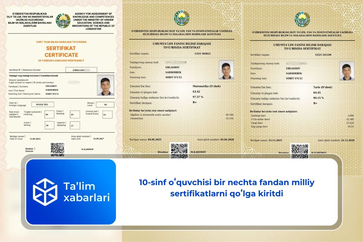 Sirdaryo viloyati Xovos tumani 17-umumta’lim maktabining 10-sinf o‘quvchisi Ergashev Sardorbek Sobit o‘g‘li bir necha fandan milliy sertifikatlarga ega bo‘ldi.