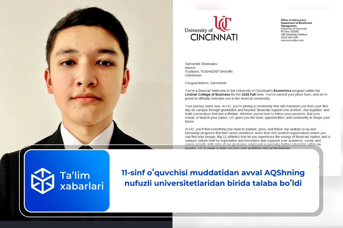 Toshkent shahar Sergeli tumanidagi 317-IDUM 11-“A” sinf o‘quvchisi Shermatov Sarvarbek AQShning Ogayo shtatidagi Sinsinnati shahrida joylashgan University of Cincinnati universitetiga muddatdan oldin o’qishga qabul qilindi.