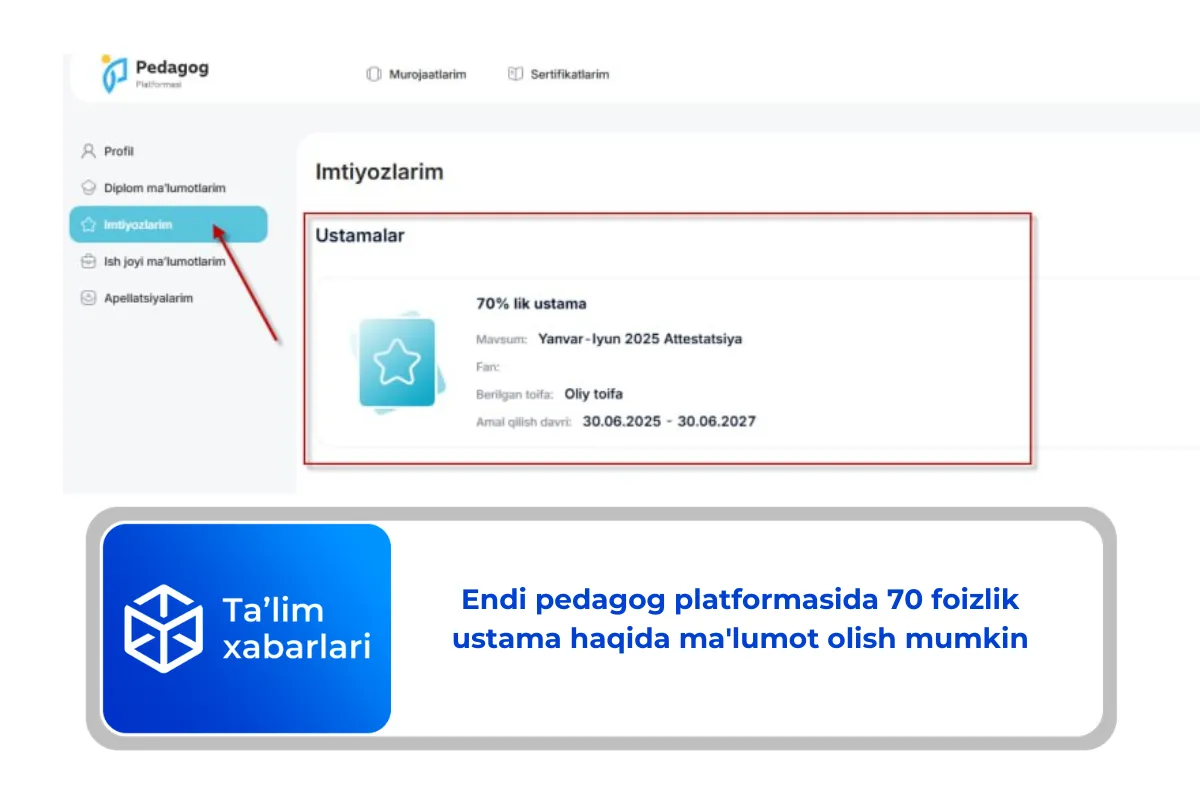 Pedagog platformasida ‘‘Imtiyozlarim’’ bo’limida ‘‘Ustamalar’’ (70 foizlik) haqida ma’lumot olish imkoniyati yaratildi.