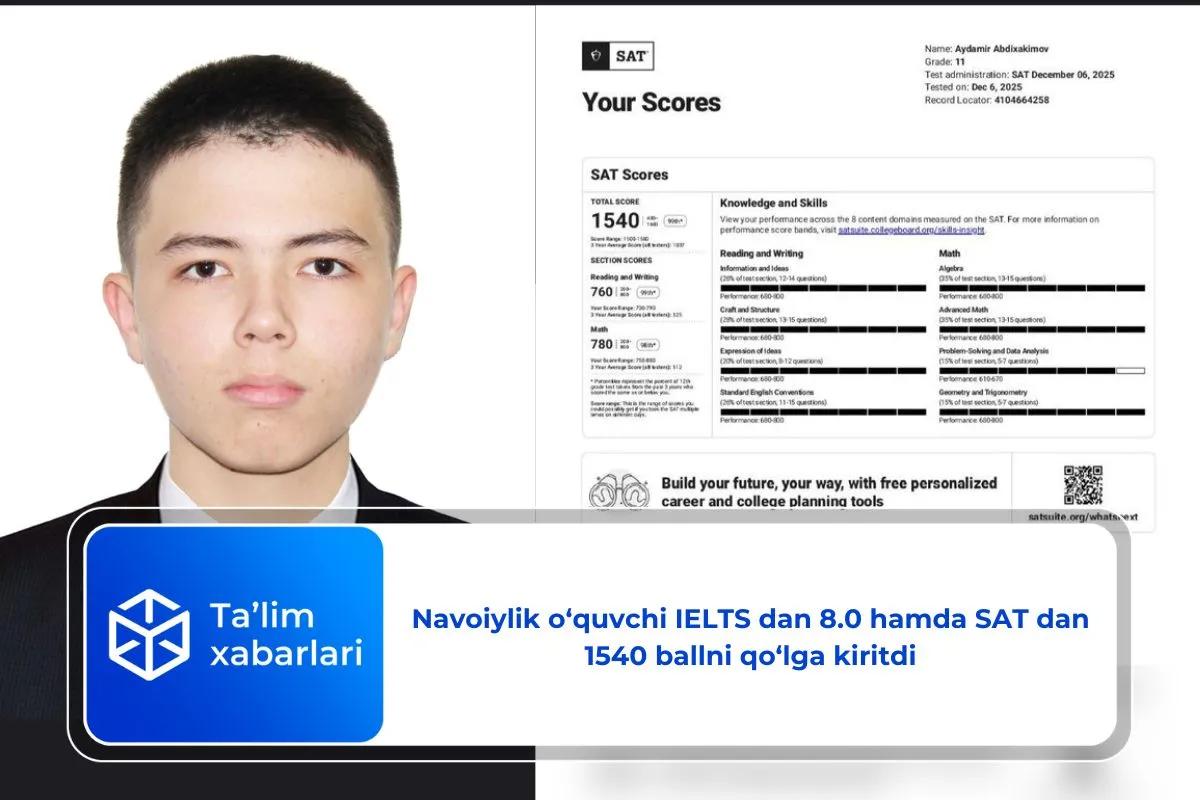 Navoiy viloyati Zarafshon shahridagi 3-umumiy o‘rta ta’lim maktabining 10-sinf o‘quvchisi Aydamir Abdihakimov xalqaro ta’lim mezonlari bo‘yicha yuqori ko‘rsatkichlarni qayd etdi.
