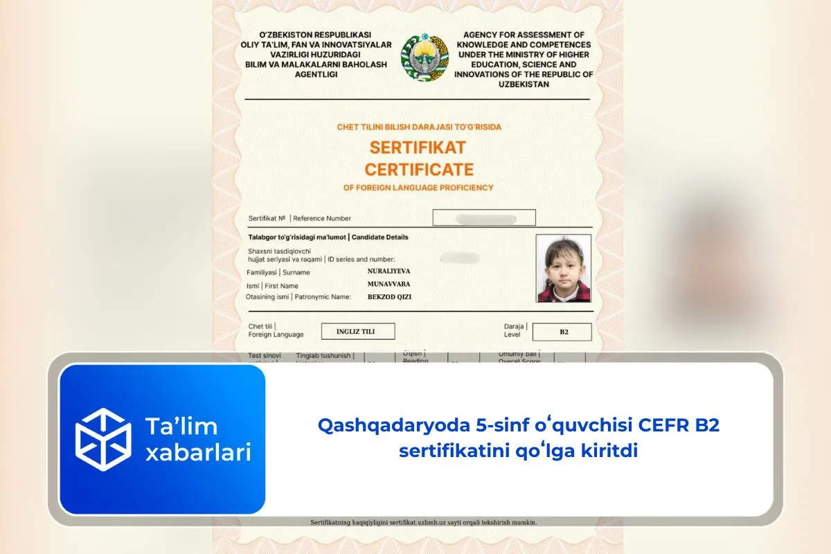 Qashqadaryo viloyati Chiroqchi tumanidagi 2-umumiy o‘rta ta’lim maktabning 5-G sinf o‘quvchisi Nuraliyeva Munavvar Bekzod qizi Chet tilini bilish darajasi boʻyicha B2 sertifikatini qoʻlga kiritdi.