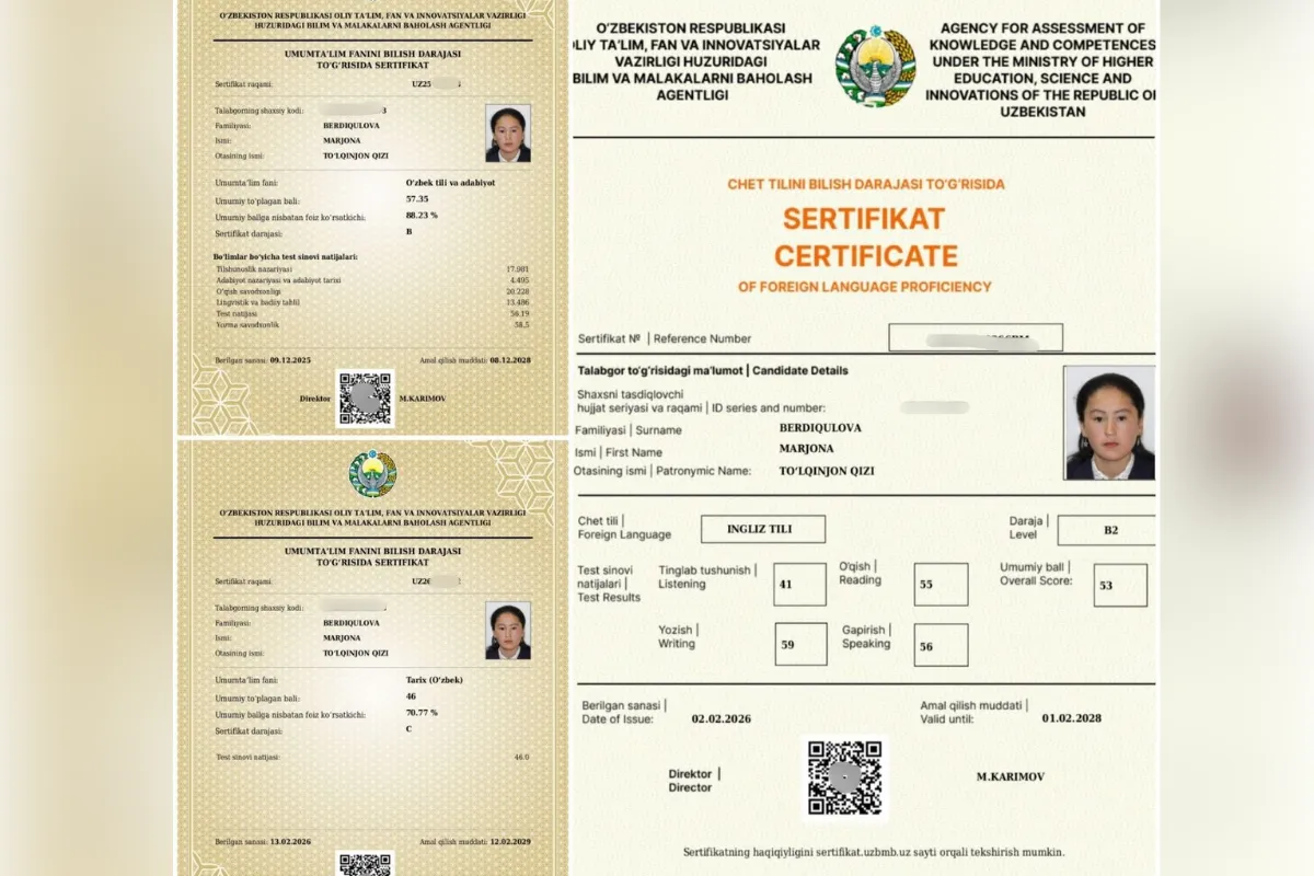 “Ingliz tilidan 6 oyda 2 marotaba B2 sertifikat oldim. Qolgan fanlardan esa 1 oy ichida tayyorlanib olganman.”