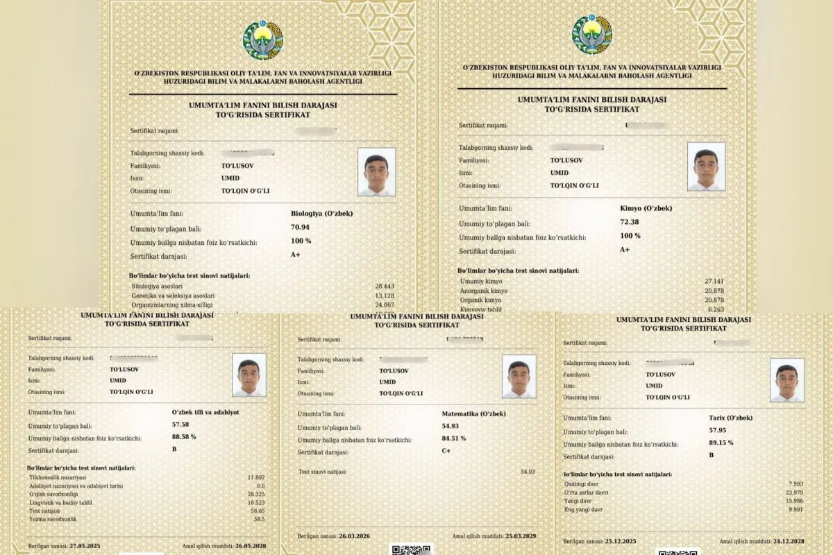 Talimxabarlari.uz sayti muxbiri mazkur oʻquvchi bilan imtihonga tayyorgarlik jarayoni haqida suhbatlashdi. U kimyo fanidan A+, biologiya fanidan A+, oʻzbek tili va adabiyoti B, matematika C+ hamda tarix fanlaridan esa B darajali milliy sertifikatlarni qoʻlga kiritgan.