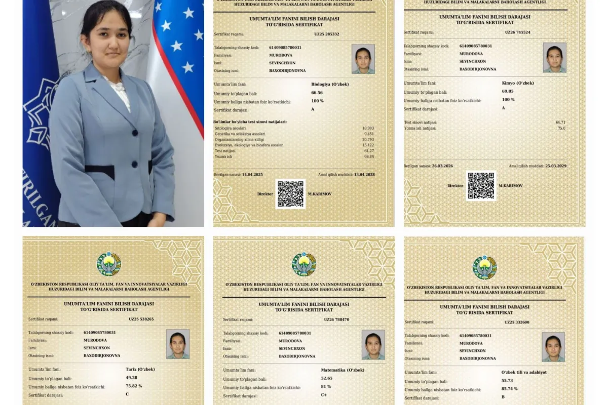 Navoiy viloyatiga ixtisoslashtirilgan maktabning 11-sinf oʻquvchisi 5 ta fandan milliy sertifikat olib, muddatidan oldin talabalikni naqd qildi.