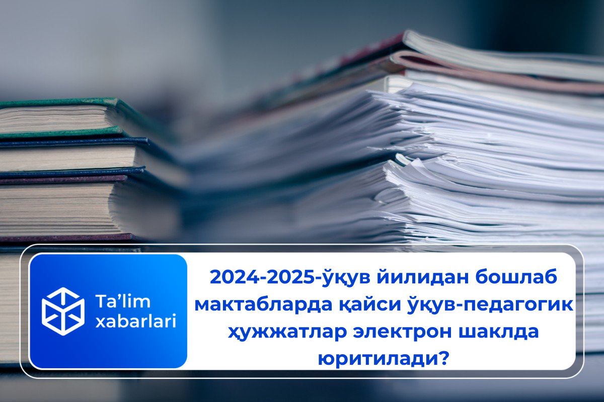2024-2025-ўқув йилидан бошлаб барча умумий ўрта таълим мактабларида ўқув-педагогик ҳужжатлар электрон шаклда юритилиши бўйича Мактабгача ва мактаб таълими вазири буйруғи қабул қилинди. Унга кўра қуйидаги ўқув-педагогик ҳужжатлар электрон тарзда юритилади: