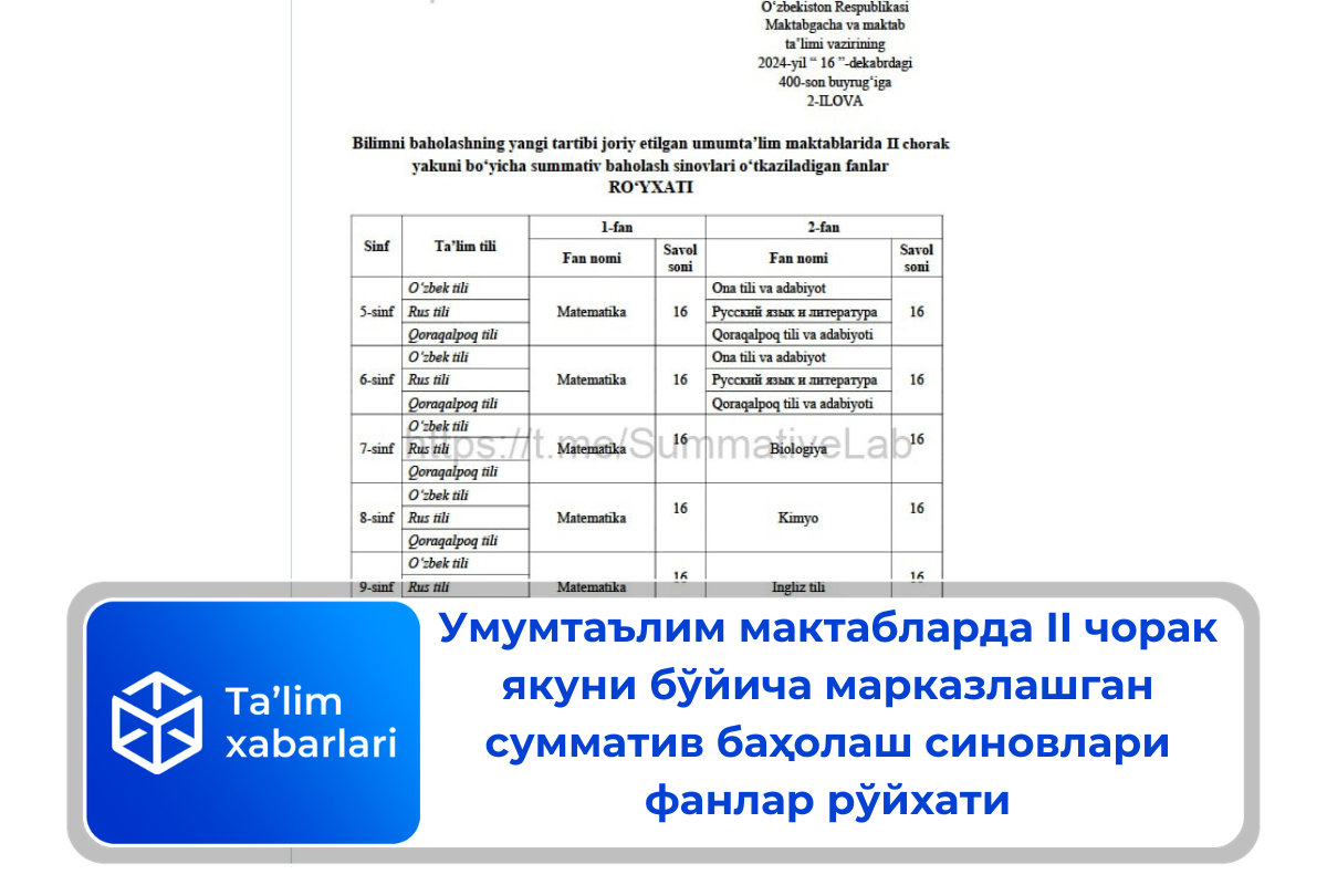 Мактабгача ва мактаб таълими вазирлигининг 2024 йил 16 декабрдаги 400-сон буйруғи асосида умумтаълим мактабларида марказлашган сумматив баҳолаш синовлари қуйидаги фанлар бўйича ташкил этилади.