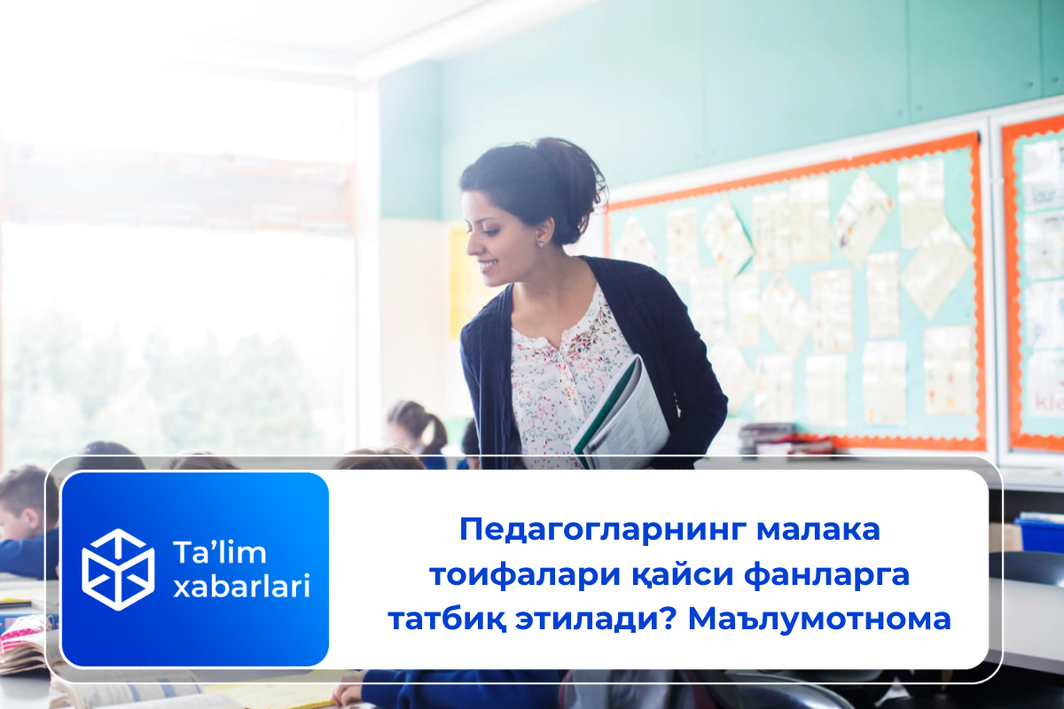 Мактабгача ва мактаб таълими вазирлигининг 11.12.2024 йилдаги 03-14-3735-сонли хати билан «Умумтаълим муассасаларида фаолият олиб бораётган ходимларнинг олган малака тоифалари фанлар кесимида татбиқ этилиши бўйича» маълумот тақдим этилди.