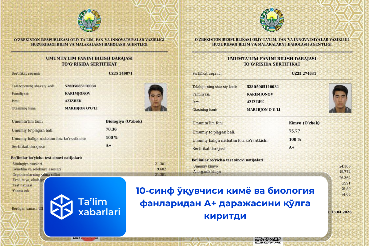 Андижон вилояти Балиқчи тумани 2-умумий ўрта таълим мактаби 10-синф ўқувчиси Каримжонов Азизбек кимё ва биология фанларидан А+ даражасини олди.