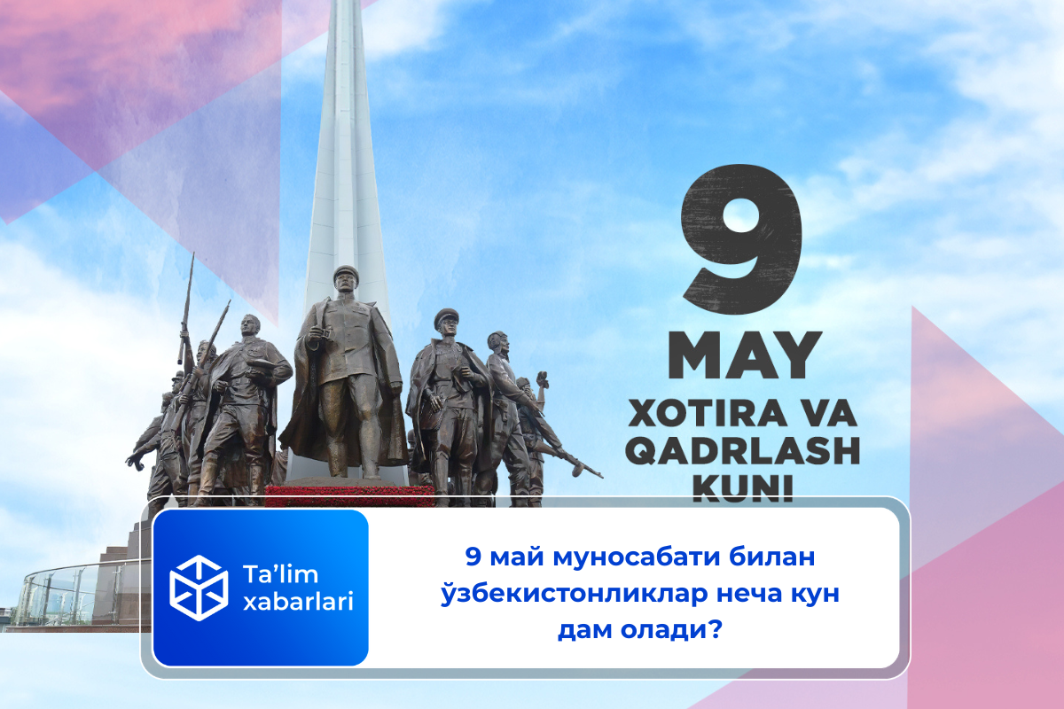 9 май — Хотира ва қадрлаш куни мунобасабати билан ўзбекистонликлар учун қуйидаги кунлар дам олиш куни ҳисобланади: