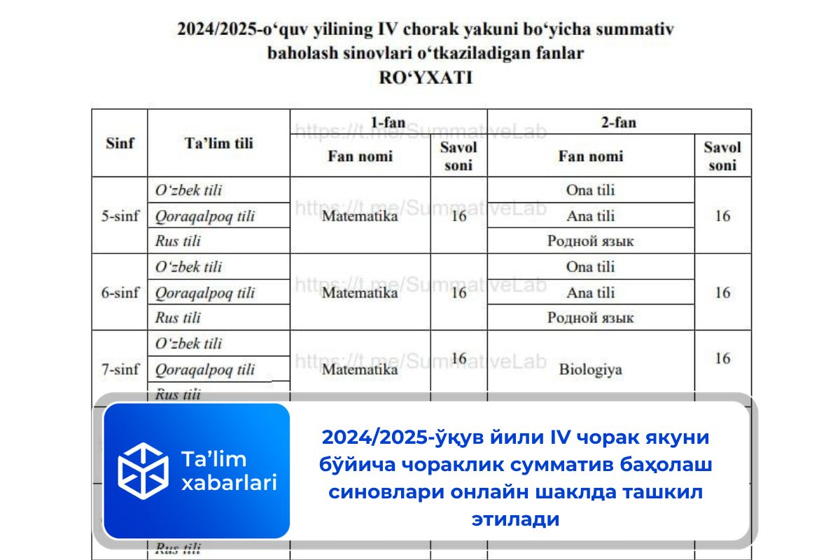 2024/2025-ўқув йили IV чорак якуни бўйича чораклик сумматив баҳолаш синовлари саналари маълум қилинди.