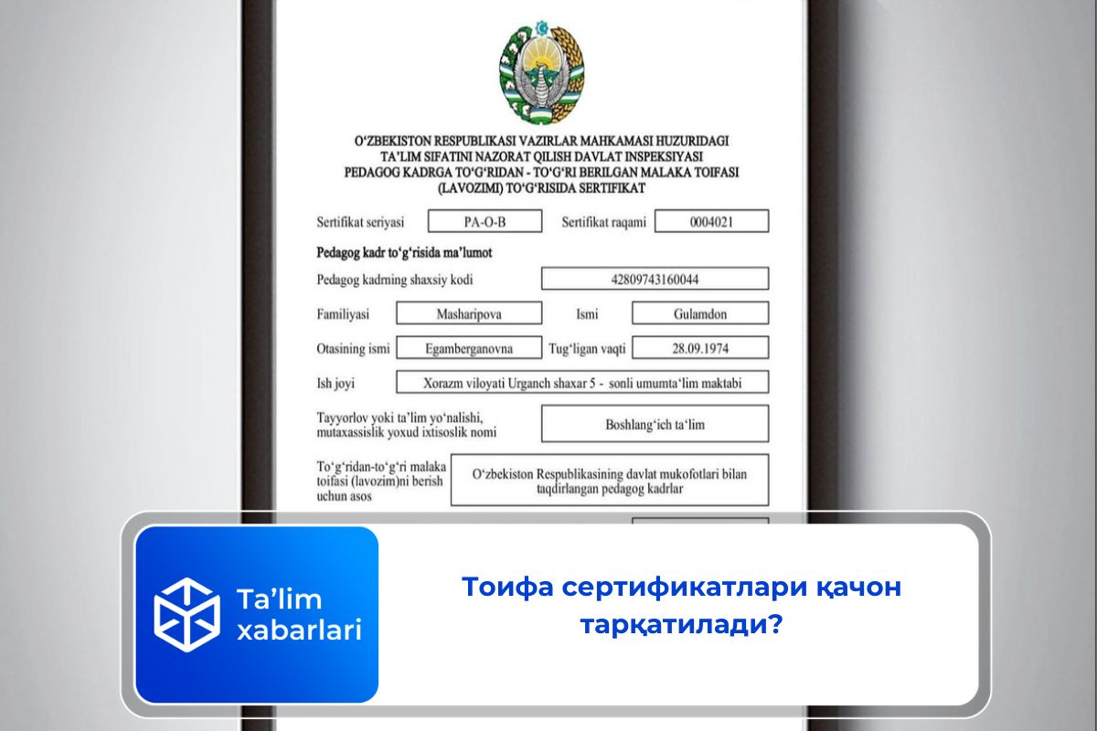 Изоҳ: Январь июнь ойларида ўтказилаётган аттестациянинг охириги куни 31 май ҳисобланади. Демак, 31 майдан бошлаб бир ой ичида июнь ойининг охириги иш кунларида Сертификатлар генерация қилинади.