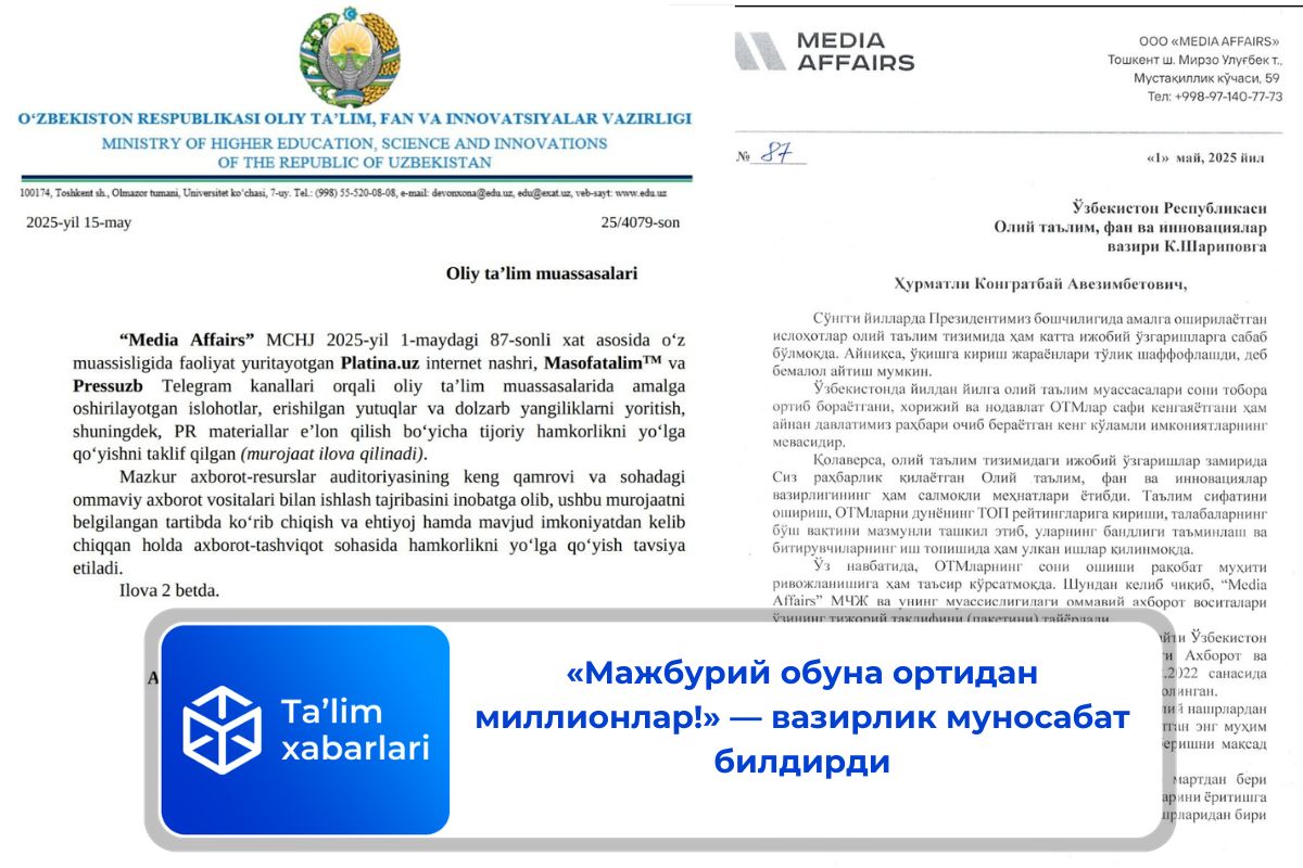 «Media Affairs» МЧЖ томонидан вазирликка олий таълимдаги ислоҳотларни ёритиш, пиар материаллар чоп этиш ва ахборот-таҳлилий ҳамкорлик бўйича таклиф келиб тушган. Бу таклифга жавобан, вазирлик томонидан олий таълим муассасаларига тавсиявий мазмундаги хат юборилган. Унда тижорий шартнома тузиш бўйича ҳеч қандай буйруқ ёки мажбурият белгиланмаган, — деди Абдуқундузова.