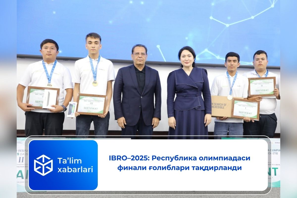 Жорий йилнинг 29-июнь куни Таълимни ривожлантириш республика илмий-методик маркази, Олий таълим, фан ва инновациялар вазирлиги, Мактабгача ва мактаб таълим вазирлиги ва Тошкент шаҳридаги Турин политехника университети ҳамкорлигида Иқтидорли болалар республика олимпиадаси (IBRO –2025) нинг финал босқичи ғолибларини тақдирлаш маросими бўлиб ўтди.