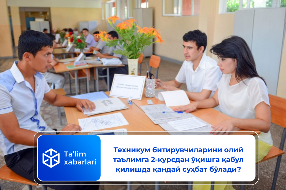 Ўзбекистон Республикаси Вазирлар Маҳкамасининг 11.01.2022 йилдаги 17-сон қарорига мувофиқ техникумларни муваффақиятли тамомлаган битирувчилар олий таълимнинг бакалавриат таълим йўналишларига 2-босқичдан суҳбат асосида ўқишга қабул қилинади.