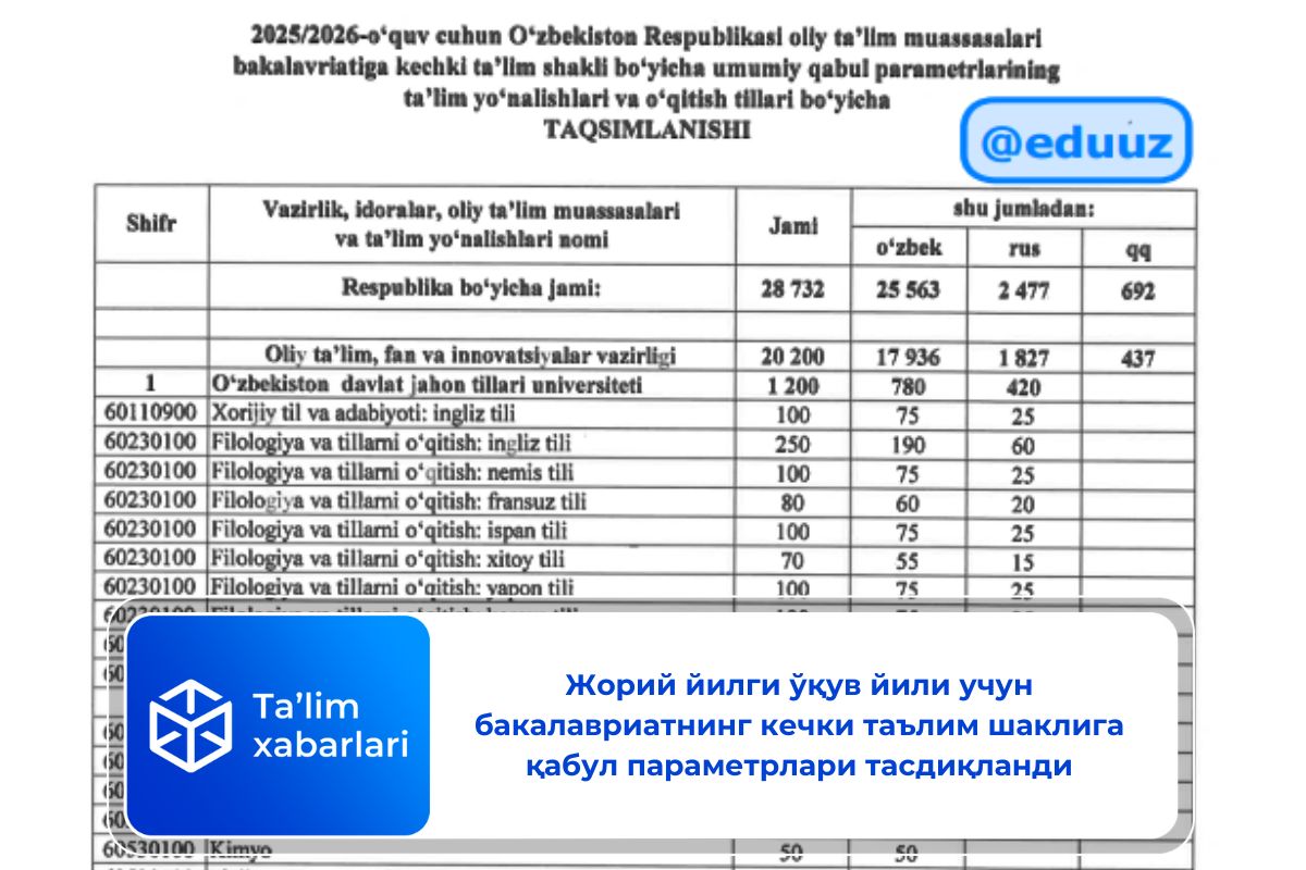 Ўзбекистон Республикаси олий таълим муассасаларининг бакалавриат йўналишлари бўйича 2025/2026-ўқув йили учун КEЧКИ таълим шаклига умумий қабул параметрларининг таълим йўналишлари ва ўқитиш тиллари бўйича тақсимоти тасдиқланди.