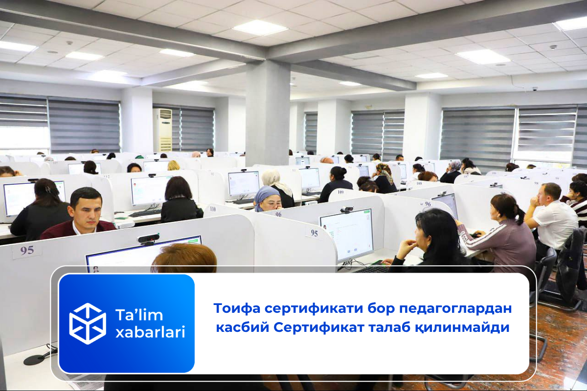 Вазирлар Маҳкамасининг 2024 йил 2 февралдаги 87-сон қарорининг 3-банди (янги таҳрири) га кўра, тоифа сертификати бор бўлган ёки тоифа тестларида «мутахассис лавозимини сақланган» педагоглардан касбий Сертификат талаб қилинмайди.