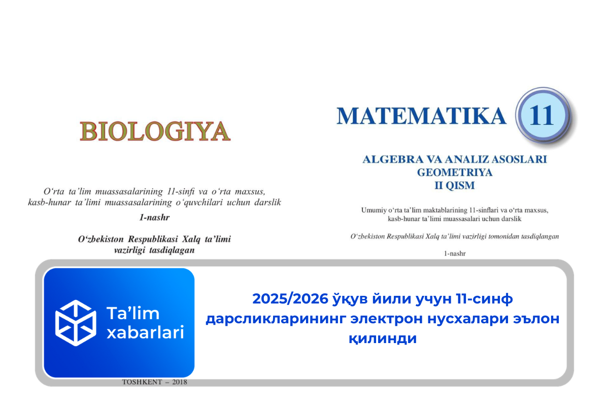 Таълимни ривожлантириш илмий-методик маркази 2025–2026-ўқув йили учун 11-синф дарсликларининг электрон нусхаларини эълон қилди.
