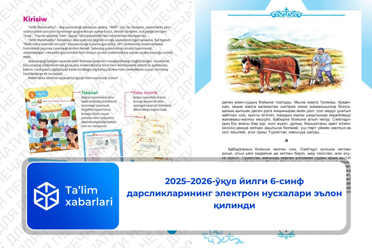 Таълимни ривожлантириш илмий-методик маркази 2025–2026-ўқув йили учун 6-синф дарсликларининг электрон нусхаларини эълон қилди.