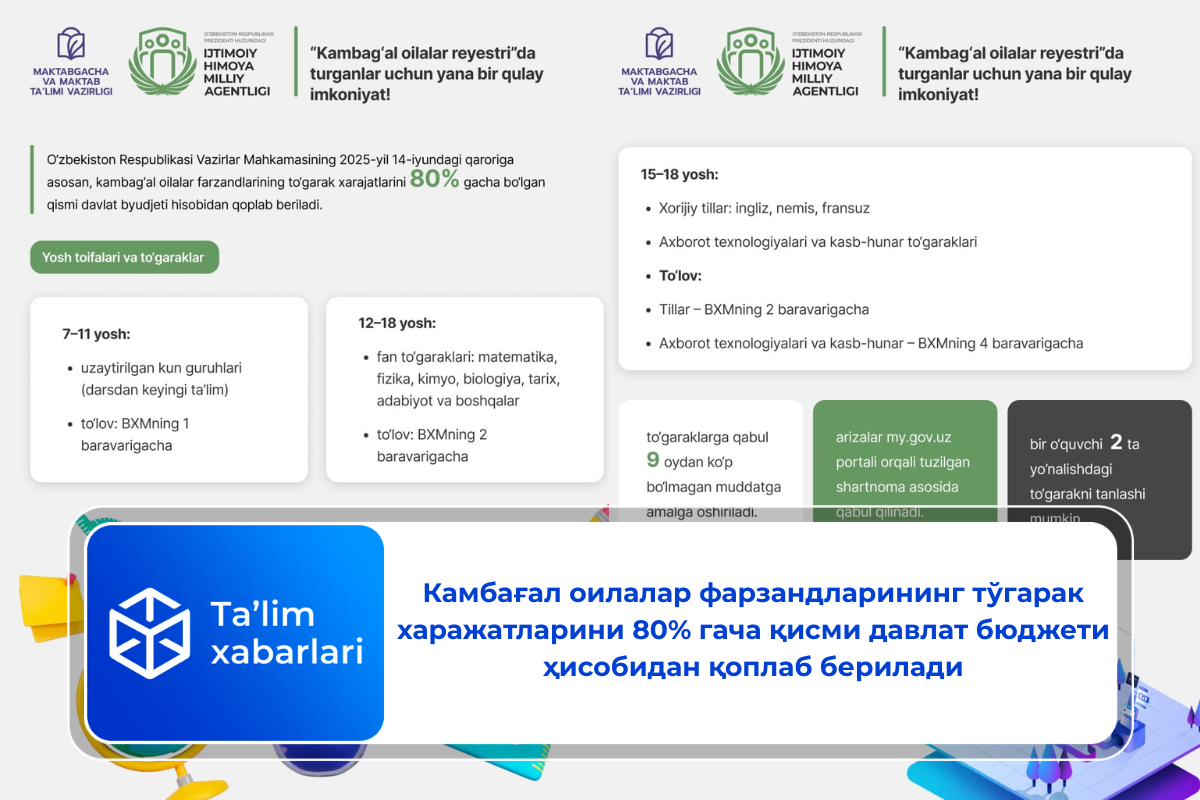 Ҳукуматнинг 2025 йил 14 июндаги 365-сонли «Давлат умумий ўрта таълим ташкилотларида айрим тоифадаги ўқувчиларни мактабдан ташқари таълимга жалб қилиш чора-тадбирлари тўғрисида»ги қарорига мувофиқ, камбағал оилаларнинг умумий ўрта таълим муассасаларида таълим олаётган фарзандларининг тўгарак харажатларининг 80 % гача қисми давлат бюджети маблағлари ҳисобидан қоплаб берилади.