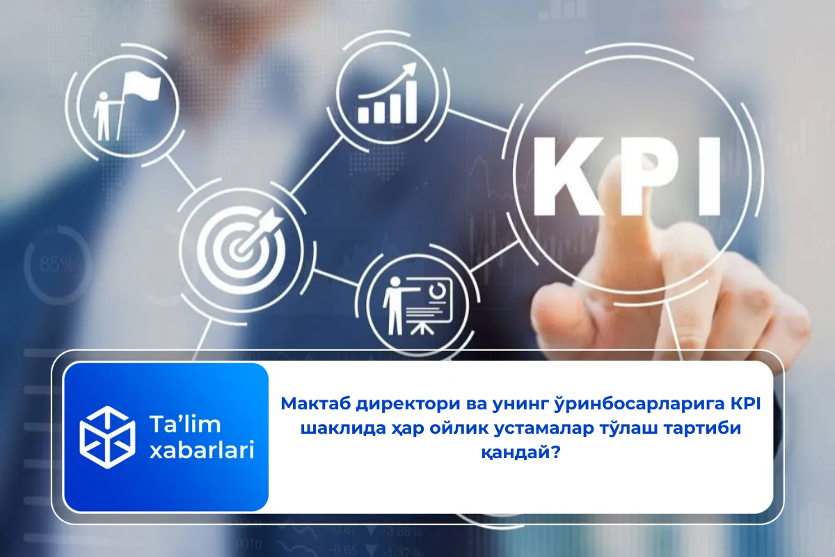 Хусусан, умумтаълим муассасасининг директори ва унинг ўринбосарларига фаолият самарадорлиги кўрсаткичлари (KPI) натижасига кўра, ҳар ойлик устамалар тўлаш тартиби белгиланган.