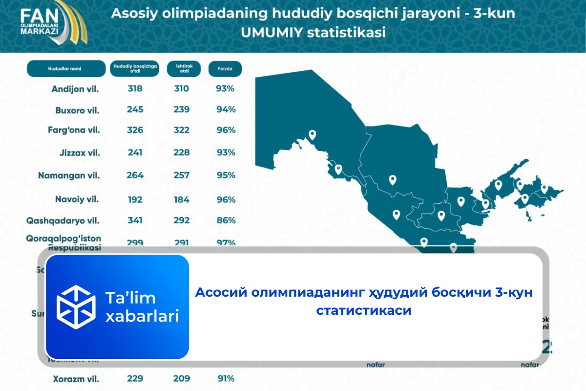 Фан олимпиадалари маркази томонидан кеча бўлиб ўтган олимпиадада қатнашган ўқувчиларнинг ҳудудлар кесимидаги 3-кундаги статистикаси эълон қилинди.