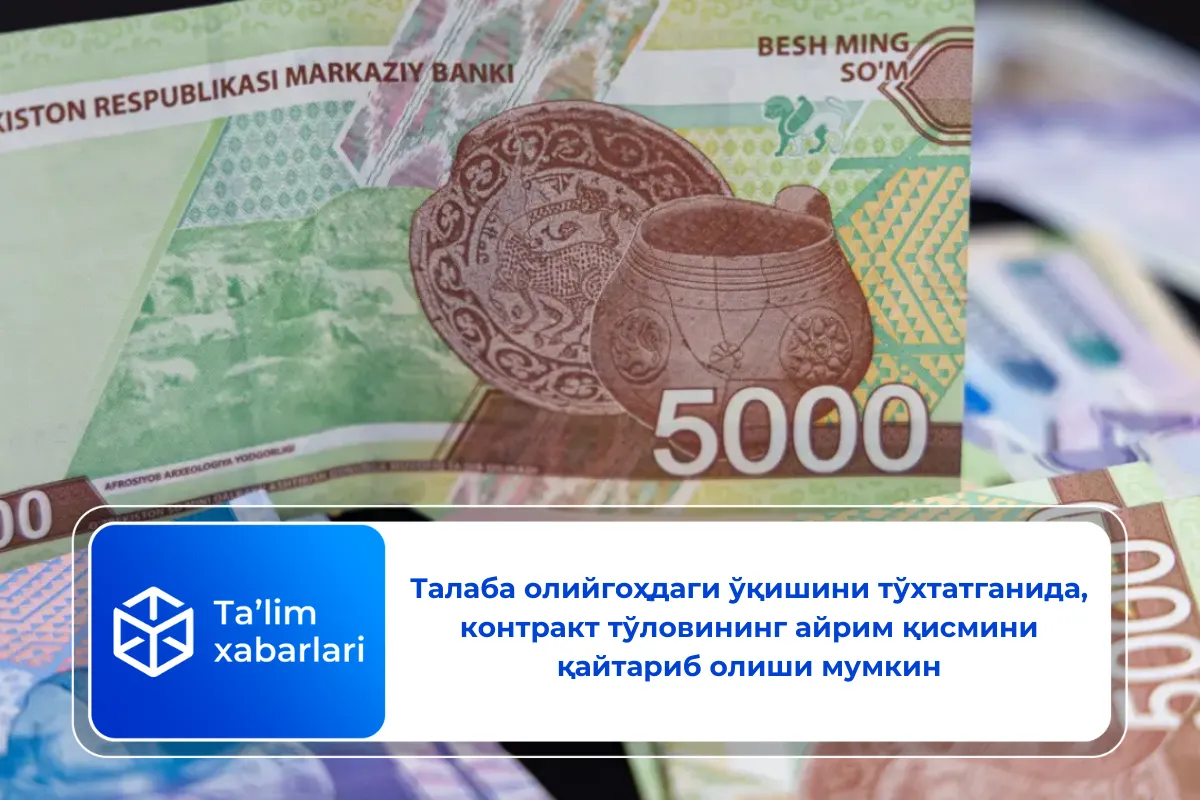 Шунга кўра бу вазиятда талаба университетдан пулнинг ҳаммасини эмас, уларнинг қилган харажатлари чегириб ташланган қисмини олиши мумкин.