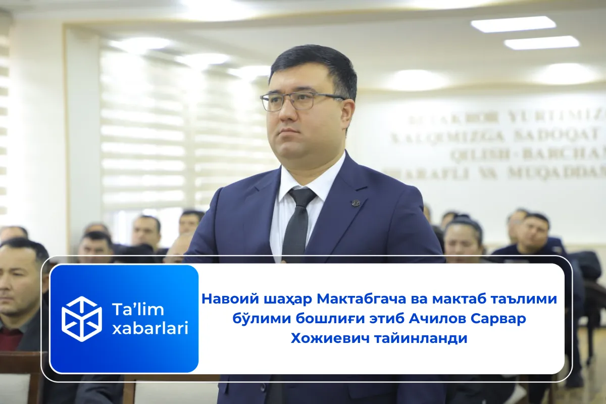 Мактабгача ва мактаб таълими вазирининг тегишли буйруғига мувофиқ Ачилов Сарвар Хожиевич Навоий шаҳар Мактабгача ва мактаб таълими бўлими бошлиғи лавозимига тайинланди.